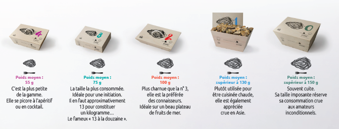 Les huitres sont présentées sous différents calibres N°4/N°3/ N°2/N°1 et différents conditionnements 2DZ, 4DZ, 8DZ, 15KG